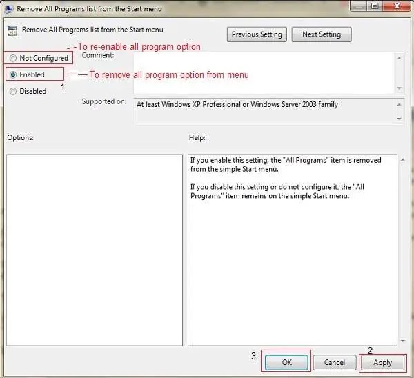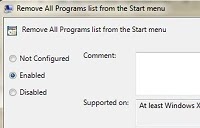 If you want to remove “All Programs” from the start menu so select on “Enabled” and click on “Apply” then “OK”.