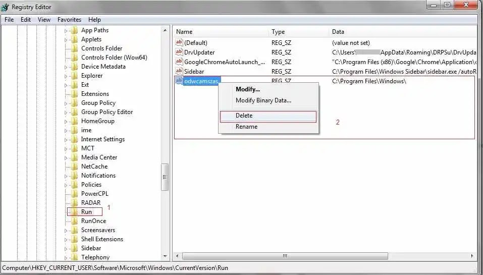 HKEY_CURRENT_USER/Software/Microsoft/Windows/CurrentVersion/Run - When you open this path you see some keys right side like odwcamszas, OPzzckkh, etc.