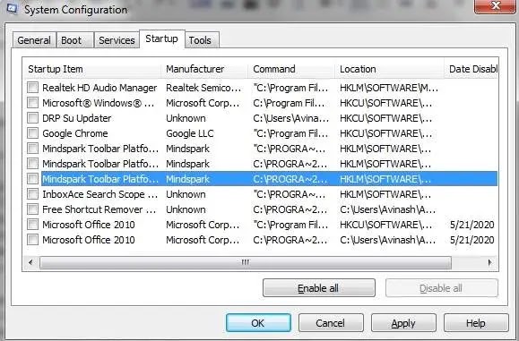 - Navigate to the Startup tab, keep a look at each attribute if you observe any strange-looking.EXE or.VBS programs then select that and click Disable.